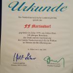 Die Urkunde der FF Martinsdorf wurde von Kommandant Oberbrandinspektor Jürgen Maier und Vize-Bgm. Birgit Boyer entgegengenommen. Die Feier im Kreise der Feuerwehr findet im Rahmen des FF Heurigen am 16.6. um 16 Uhr statt. Dazu möchten wir Sie recht herzlich einladen.